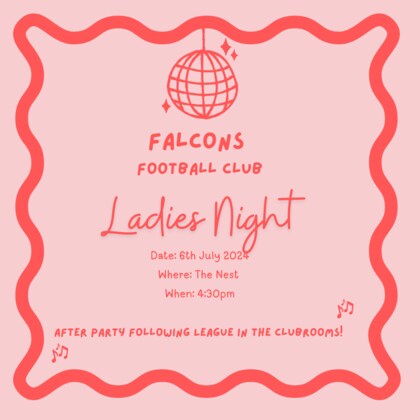 It's Ladies Night at The Nest! Get the girls together and head down to The Nest to watch our Falcons take on Dampier Sharks!   Date: Saturday, July 6th Where: Inside The Nest - exclusive area reserved just for ladies attending event Tickets: $25 What's included: 2 drink tokens for drink of your choosing...did someone say strawberry daquiris? Grazing table by Nic's Collective There will be raffle prizes up for grabs on the night! Stick around for the Ladies Night - After Party (after Reserve / League Awards) for a boogie and more food by Stardeck Group